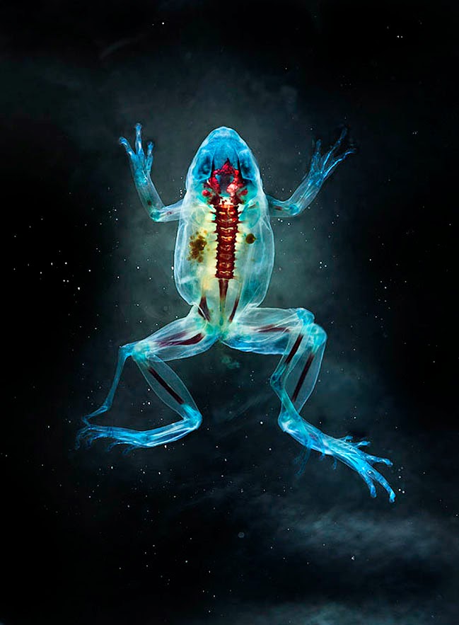DFA 186: Hadēs. 2012. Unique digital-C print on watercolor paper. Cleared and stained Pacific tree frog collected in Aptos, California in scientific collaboration with Stanley K. Sessions. 46 x 34 in. (c) Brandon Ballengée 2014 http://brandonballengee.com/