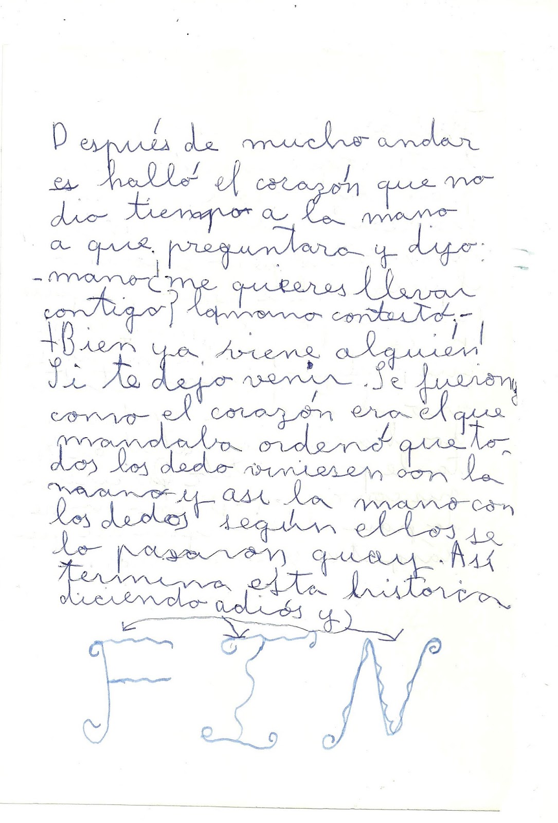 Después de mucho andar halló el corazón que no dio tiempo a la mano a que preguntara y dijo: -mano ¿me quieres llevar contigo?-. La mano contestó: ¡bien ya viene alguien! Sí te dejo venir. Se fueron. Como el corazón era el que mandaba ordenó que todos los dedos viniesen con la mano y así la mano con los dedos según ellos se lo pasaron guay. Así termina esta historia diciendo adiós y fin.