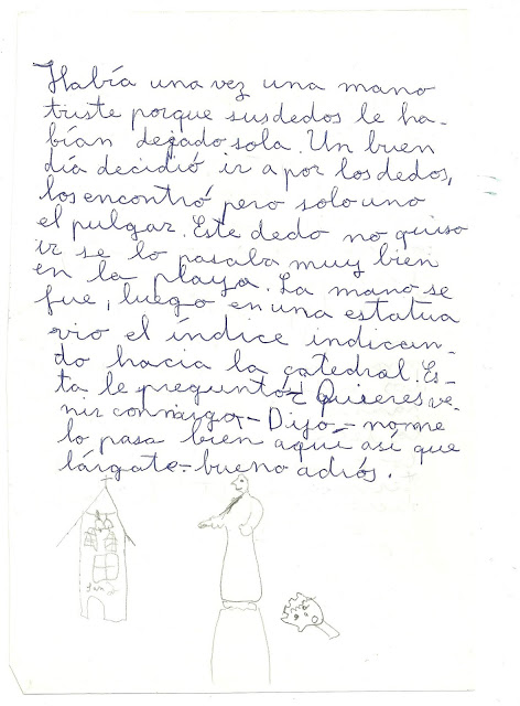 Había una vez una mano triste porque sus dedos le habían dejado sola. Un buen día decidió ir a por los dedos, los encontró pero solo uno, el pulgar. Este dedo no quiso irse se lo pasaba muy bien en la playa. La mano se fue, luego en una estatua vio el índice indicando hacia la catedral. Esta le preguntó ¿quieres venir conmigo? Dijo -no, me lo paso bien aquí así que lárgate-. Bueno adiós.