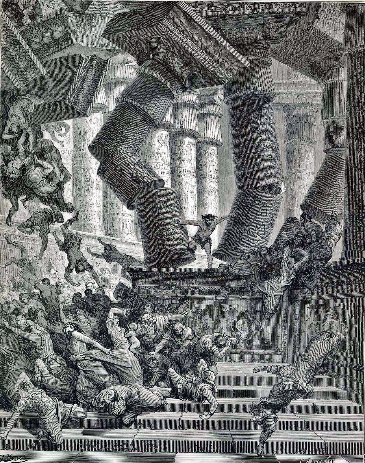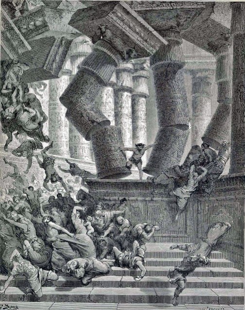 Sansón derriba las columnas del templo de los filisteos. Grabado de Gustave Doré, 1866.