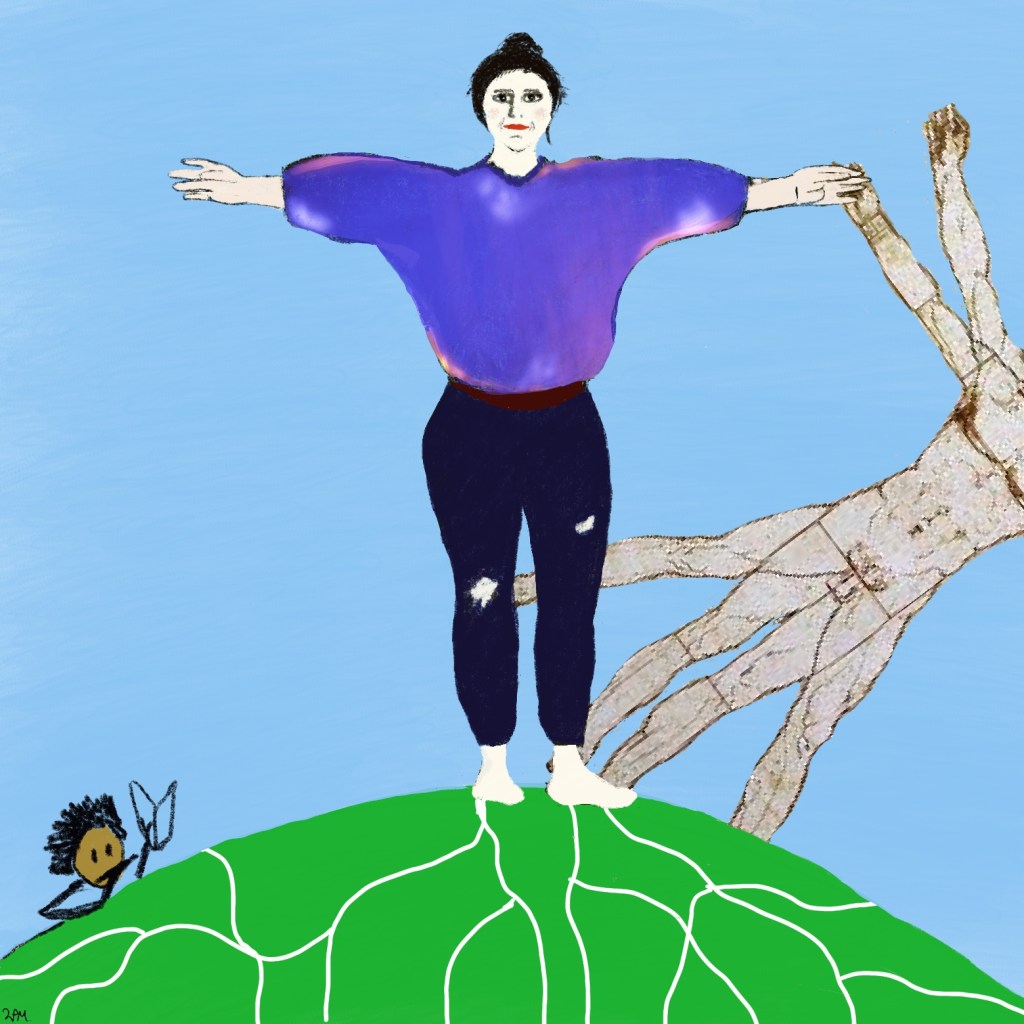 La cercanía llega cuando miro de nuevo sus pies y toma sentido su color blanco, blanco. La mujer-árbol está enraizándose en la profundidad. Su raigambre topa con esos muros ocultos de los que absorbe los restos de cal confusa y confundida en las paredes de los hogares que la tierra cubrió. Esas raíces aspiran y reparten albo tono a la que allí se pose y despliegue su abrazo desde lo alto de esta zona verde apoyada en lo que hace un siglo llamaban el Palomar de Rivera.