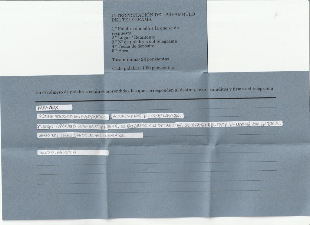 Una palabra donada por Álex, respondida por Agustín Frago en la sesión de Escribir telegramas para donantes de palabras, con LetraLab, en la librería La Imprenta, Madrid.