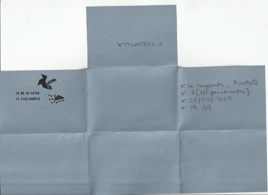 Una palabra donada por Mónica Gutiérrez, respondida por Picatoste en la sesión de Escribir telegramas para donantes de palabras, con LetraLab, en la librería La Imprenta, Madrid.